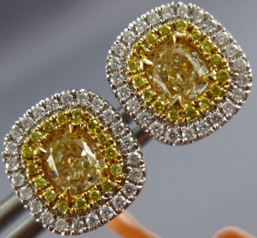 ESTATE 18KT WHITE AND YELLOW GOLD STUD EARRINGS. 3D OVAL SQUARE SOLITAIRE DOUBLE HALO FILIGREE DESIGN. DIAMONDS ARE F/G COLOR, VSSI CLARITY. WHITE DIAMONDS ARE .22 CARATS. FANCY YELLOW DIAMONDS ARE 1.25 CARATS. MEASURES 10mm X 9mm. WRITTEN APPRAISAL AVAILABLE. COMES IN A PRESENTABLE GIFT BOX.