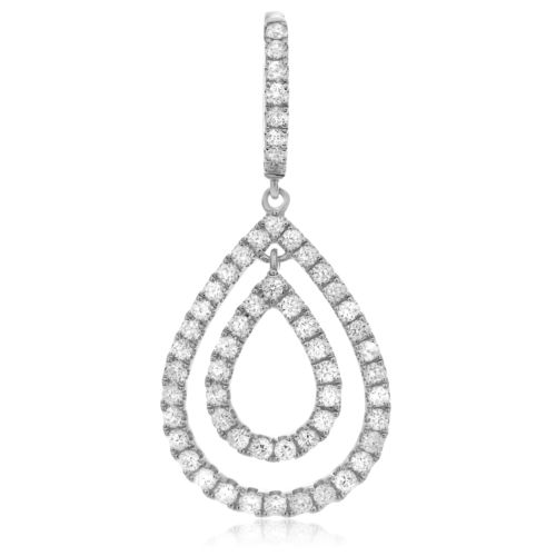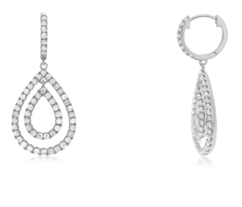 ESTATE 14KT WHITE GOLD HUGGIE HANGING EARRINGS. 3D TEAR DROP DESIGN. DIAMONDS ARE F/G COLOR, VSSI CLARITY, 1.48 CARATS. MEASURES 35mm X 16mm. WRITTEN APPRAISAL AVAILABLE. COMES IN A PRESENTABLE GIFT BOX.