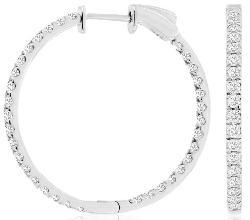 ESTATE 14KT WHITE GOLD HOOP HANGING EARRINGS. 3D CLASSIC INSIDE OUT DESIGN. DIAMONDS ARE F/G COLOR, VSSI CLARITY 1.50 CARATS. WRITTEN APPRAISAL AVAILABLE. COMES IN A PRESENTABLE GIFT BOX.