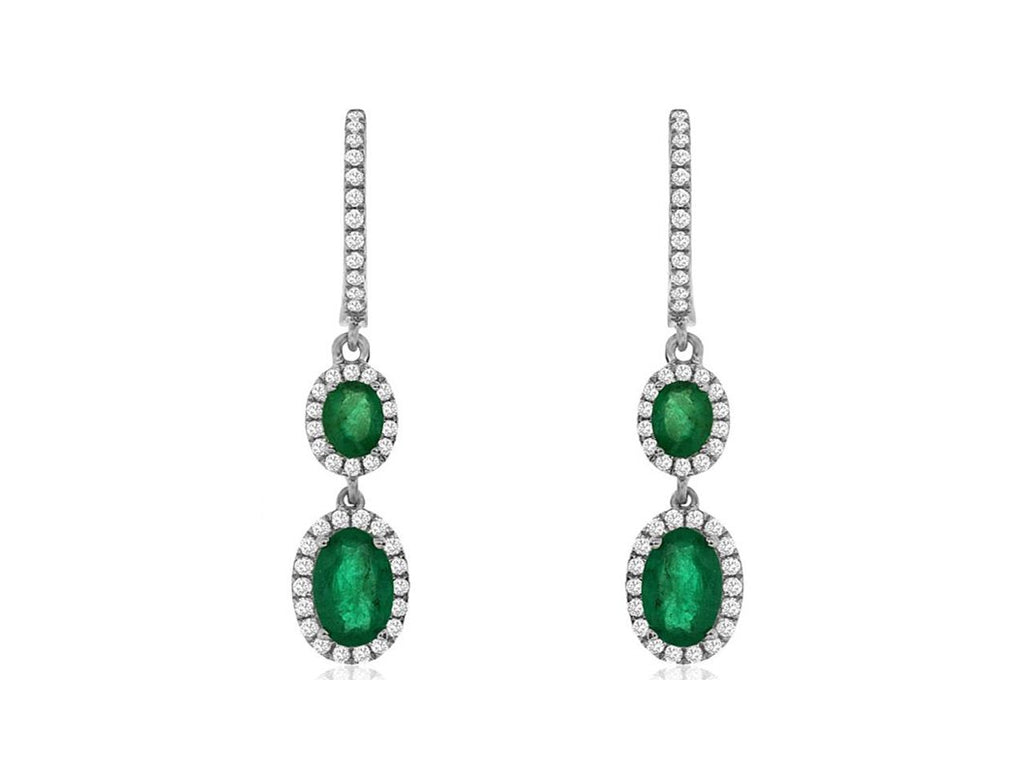 ESTATE 1.50CT DIAMOND & AAA EMERALD 14K WHITE GOLD OVAL & ROUND HANGING EARRINGS