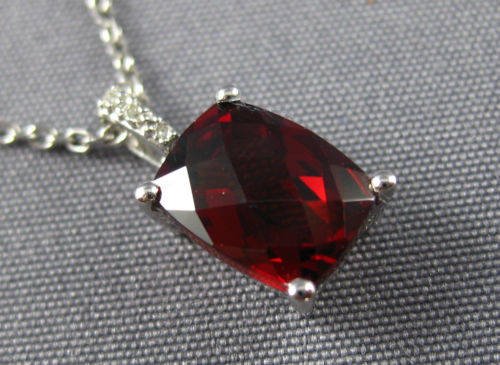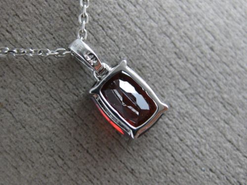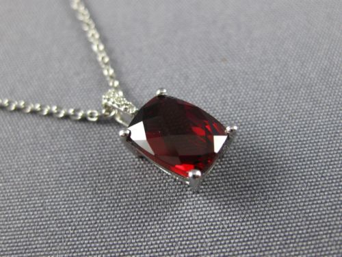ESTATE 14KT WHITE GOLD FLOATING PENDANT. 3D CUSHION CUT CLASSIC DESIGN. DIAMONDS ARE F/G COLOR, VSSI CLARITY .02 CARATS. AAA GARNET IS 1.50 CARATS. MEASURES 12mm X 6mm. WRITTEN APPRAISAL AVAILABLE. COMES IN A PRESENTABLE GIFT BOX.