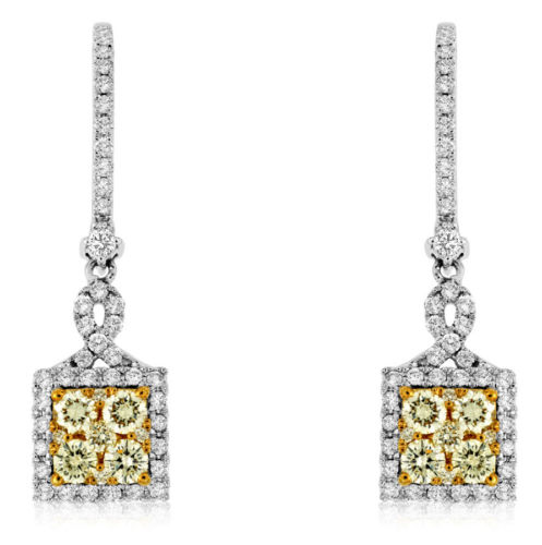 ESTATE 14KT WHITE GOLD HANGING EARRINGS. 3D HALO INFINITY DESIGN. DIAMONDS ARE F/G COLOR, VSSI CLARITY .70 CARATS. FANCY YELLOW DIAMONDS ARE .82 CARATS. WRITTEN APPRAISAL AVAILABLE. COMES IN A PRESENTABLE GIFT BOX.