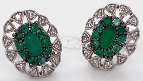 ESTATE 14KT WHITE GOLD STUD EARRINGS. 3D FLOWER FILIGREE DESIGN. ROUND DIAMONDS ARE F/G COLOR, VSSI CLARITY .20 CARATS. AAA ROUND EMERALDS ARE 1.34 CARATS.