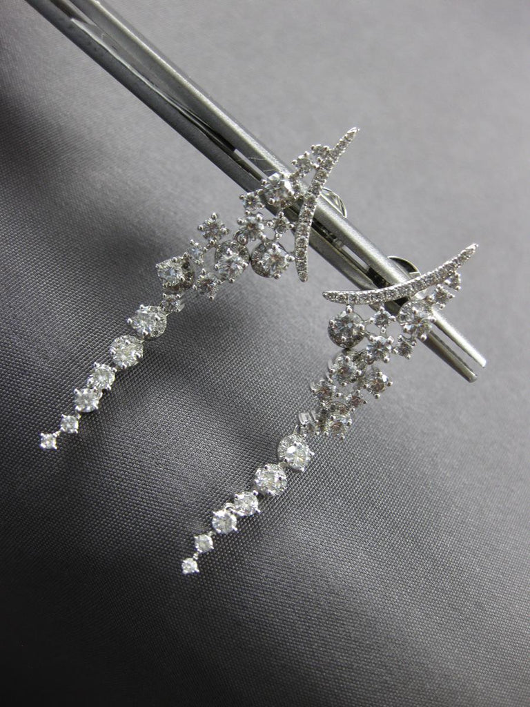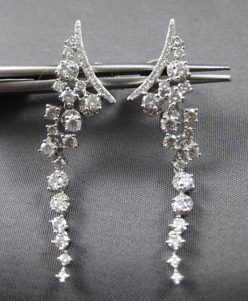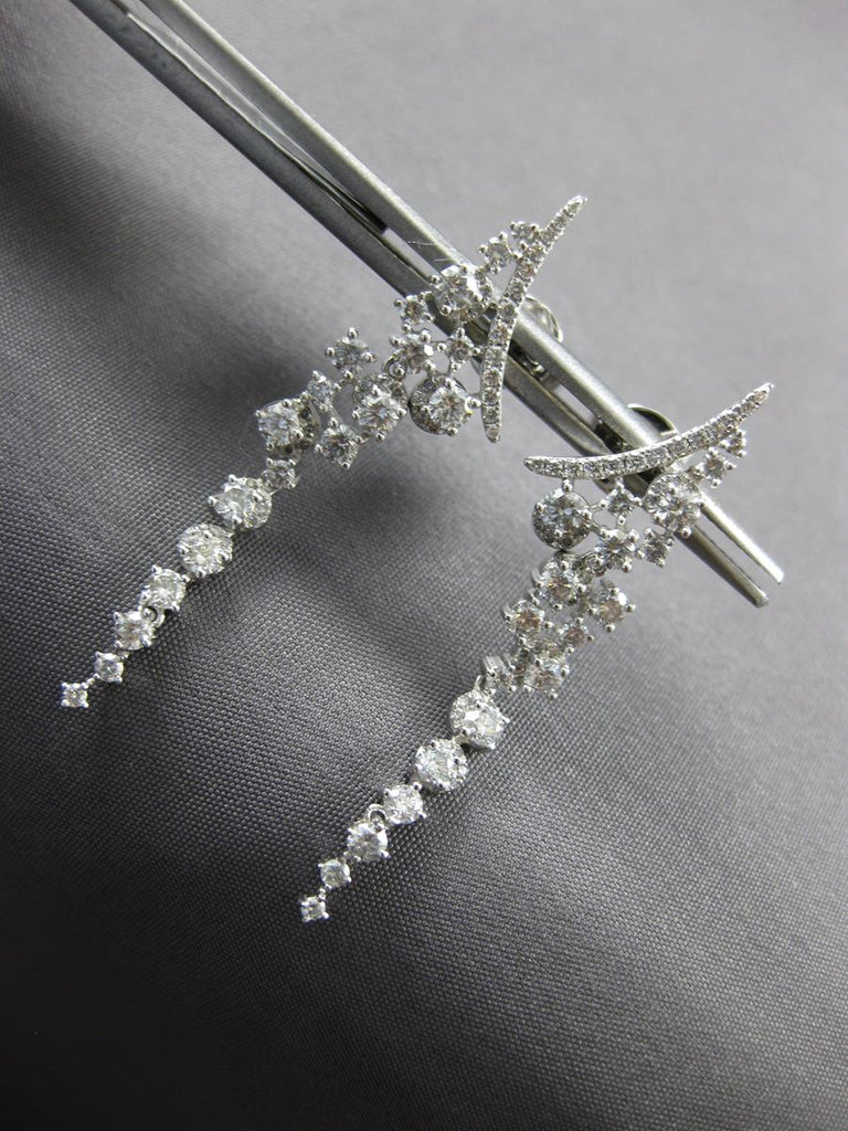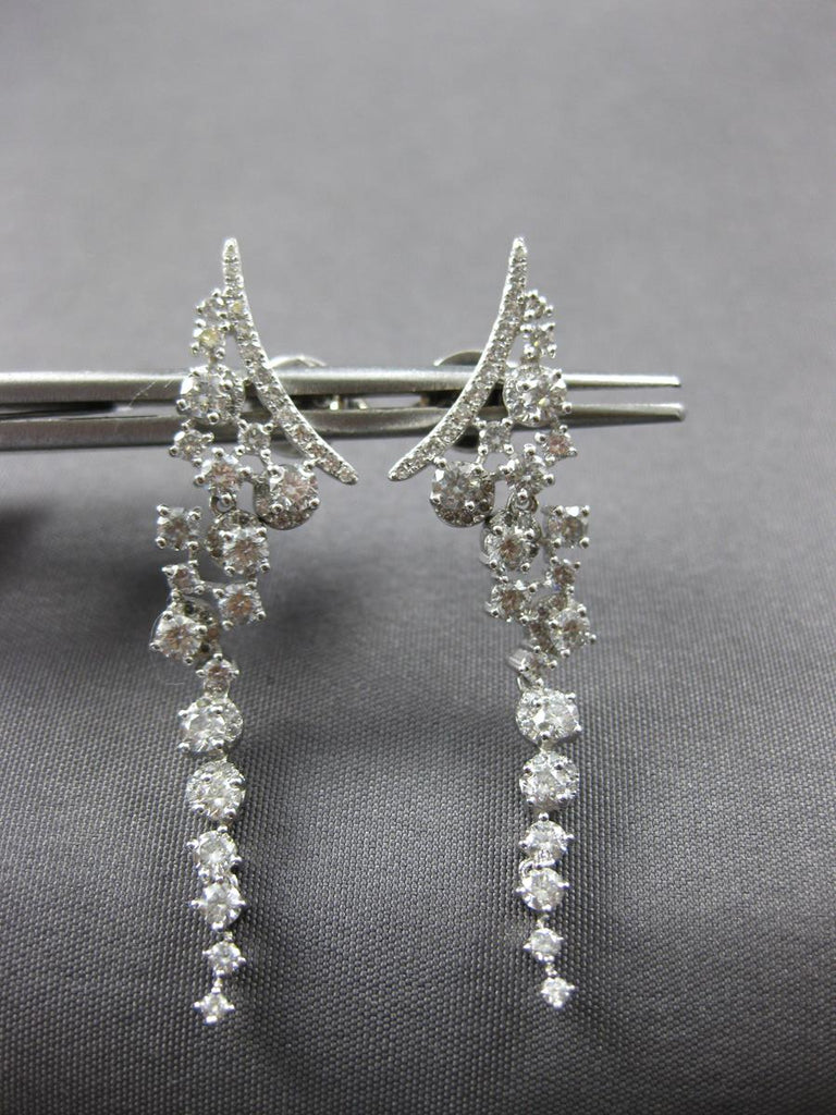 ESTATE 18KT WHITE GOLD HANGING EARRINGS. 3D CLUSTER CHANDELIER HALF MOON DESIGN. DIAMONDS ARE F/G COLOR, VS CLARITY 1.55 CARATS. MEASURES 34mm WIDE. WRITTEN APPRAISAL AVAILABLE. COMES IN A PRESENTABLE GIFT BOX.