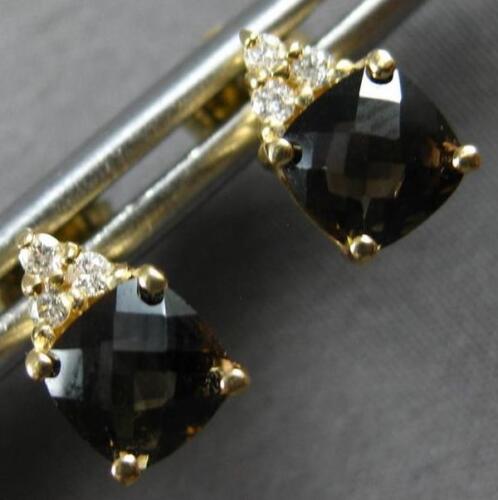ESTATE 14KT YELLOW GOLD STUD EARRINGS. 3D FLOWER DESIGN. ROUND DIAMONDS ARE F/G COLOR, VSSI CLARITY .06 CARATS. AAA EXTRA FACETED CUSHION CUT SMOKY TOPAZ ARE 1.50 CARATS. MEASURES 8mm X 5mm. WRITTEN APPRAISAL AVAILABLE. COMES IN A PRESENTABLE GIFT BOX.