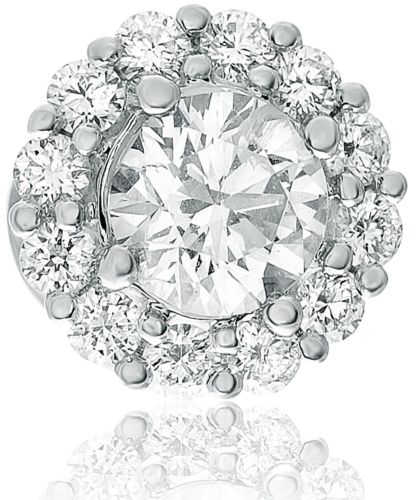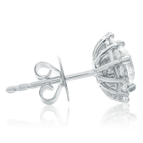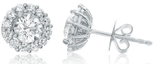 ESTATE 18KT WHITE GOLD STUD EARRINGS. 3D CLASSIC ROUND FLOWER SOLITAIRE HALO DESIGN. DIAMONDS ARE F/G COLOR, VSSI CLARITY 1.58 CARATS. MEASURES 9mm X 9mm. WRITTEN APPRAISAL AVAILABLE. COMES IN A PRESENTABLE GIFT BOX.