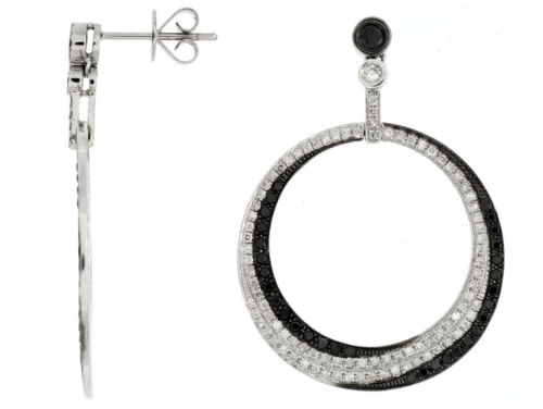 ESTATE 14KT WHITE GOLD HANGING EARRINGS. 3D LOVE KNOT, CIRCLE OF LIFE DESIGN. DIAMONDS ARE F/G COLOR, VSSI CLARITY  .85 CARATS. BLACK DIAMONDS ARE .80 CARATS. WRITTEN APPRAISAL AVAILABLE. COMES IN A PRESENTABLE GIFT BOX.