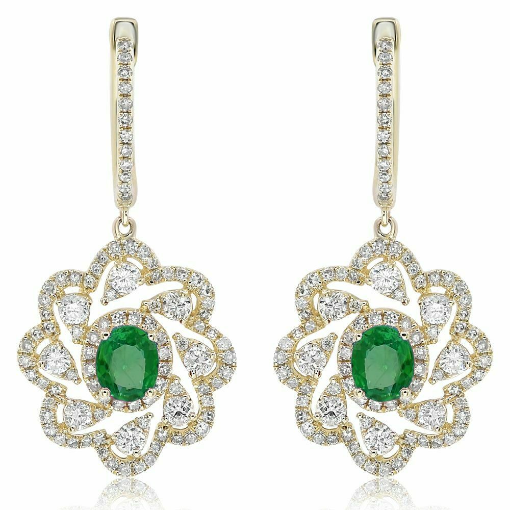 ESTATE14KT YELLOW GOLDHANGING EARRINGS. 3D FLOWERDESIGN. DIAMONDS ARE F/G COLOR, VSSI CLARITY 1.04 CARATS. AAA EMERALDS ARE .66 CARATS.WRITTEN APPRAISAL AVAILABLE. COMES IN A PRESENTABLE GIFT BOX.