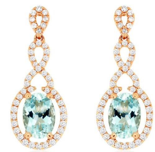 ESTATE 14KT ROSE GOLD HANGING EARRINGS. 3D HALO INFINITY DESIGN. ROUND DIAMONDS ARE F/G COLOR, VSSI CLARITY .42 CARATS. AAA EXTRA FACETED OVAL AQUAMARINES ARE 1.35 CARATS. WRITTEN APPRAISAL AVAILABLE. COMES IN A PRESENTABLE GIFT BOX.