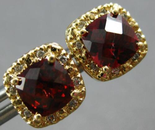 ESTATE 14KT YELLOW GOLD FUN STUD EARRINGS. 3D HALO SQUARE DESIGN. ROUND DIAMONDS ARE F/G COLOR, VSSI CLARITY .08 CARATS. AAA EXTRA FACETED CUSHION CUT GARNETS ARE 1.80 CARATS. EARRINGS MEASURE 8.8mm WIDE. WRITTEN APPRAISAL AVAILABLE. COMES IN A PRESENTABLE GIFT BOX.