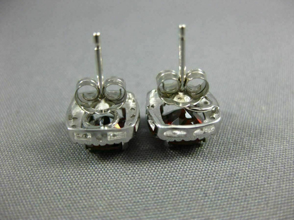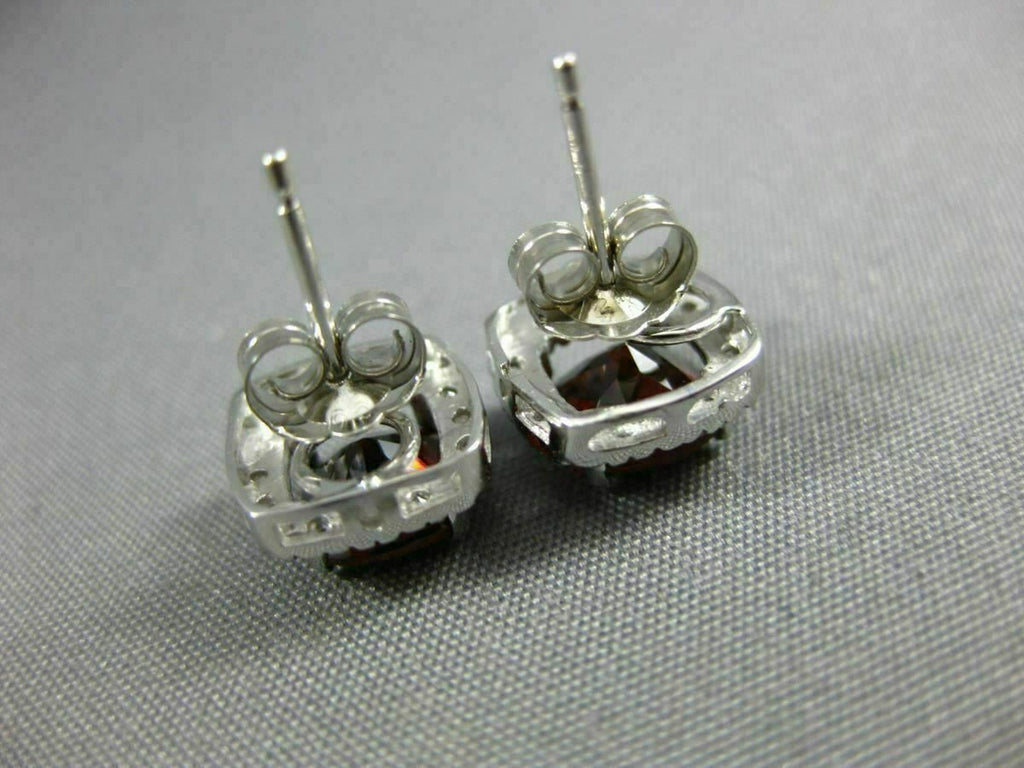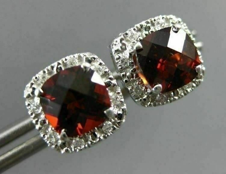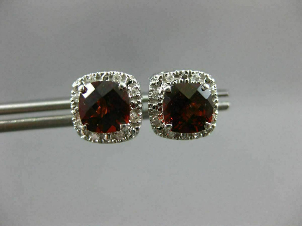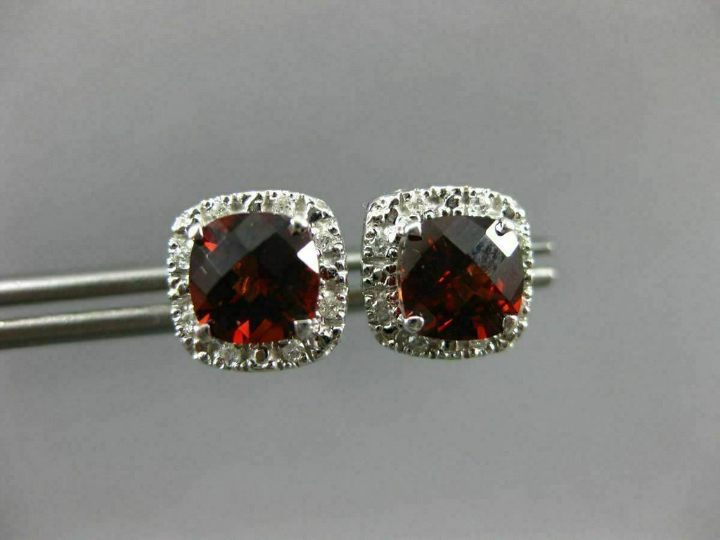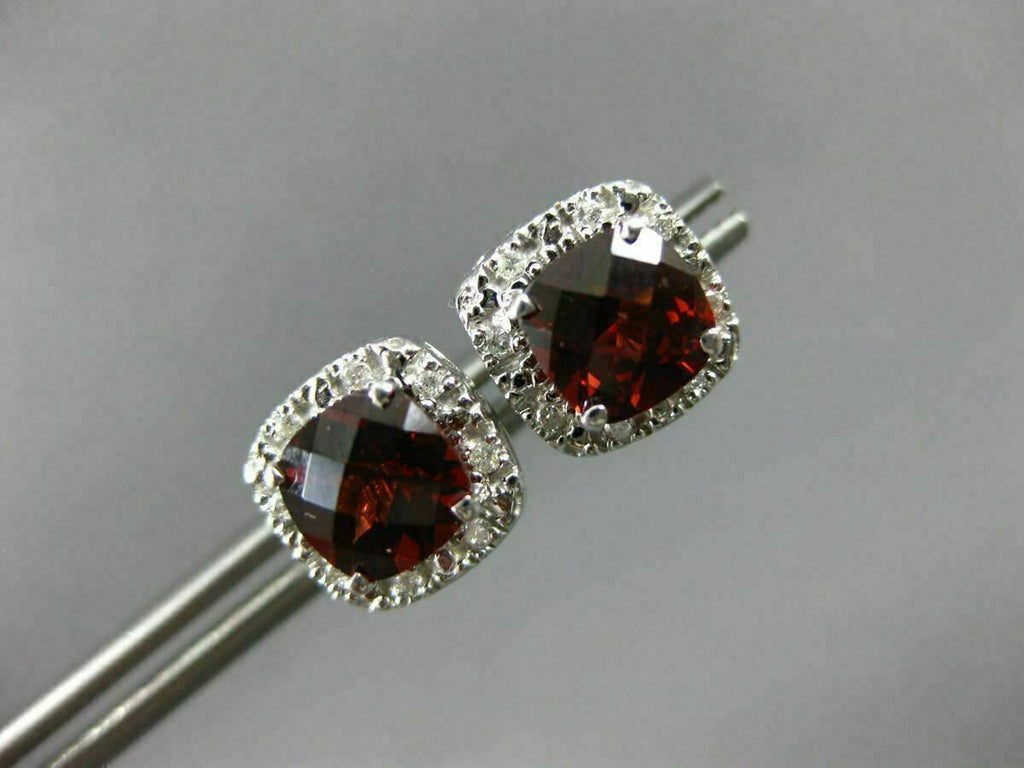 ESTATE 14KT WHITE GOLD CLASSIC STUD EARRINGS. 3D SQUARE HALO DESIGN. DIAMONDS ARE F/G COLOR, VSSI CLARITY .08 CARATS. AAA GARNET ARE 1.80 CARATS. MEASURES 9mm WIDE. WRITTEN APPRAISAL AVAILABLE. COMES IN A PRESENTABLE GIFT BOX