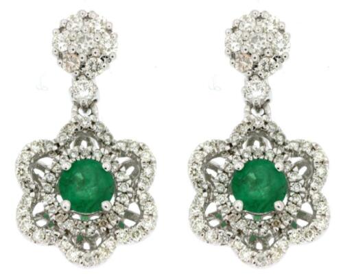 ESTATE 1.90CT DIAMOND & AAA EMERALD 14K WHITE GOLD ROUND FLOWER HANGING EARRINGS