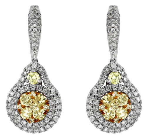 ESTATE 14KT WHITE GOLD HANGING EARRINGS. 3D ROUND CLUSTER DOUBLE HALO DESIGN. DIAMONDS ARE F/G COLOR, VSSI CLARITY .90 CARATS. FANCY YELLOW DIAMONDS ARE 1.0 CARATS. WRITTEN APPRAISAL AVAILABLE. COMES IN A PRESENTABLE GIFT BOX..