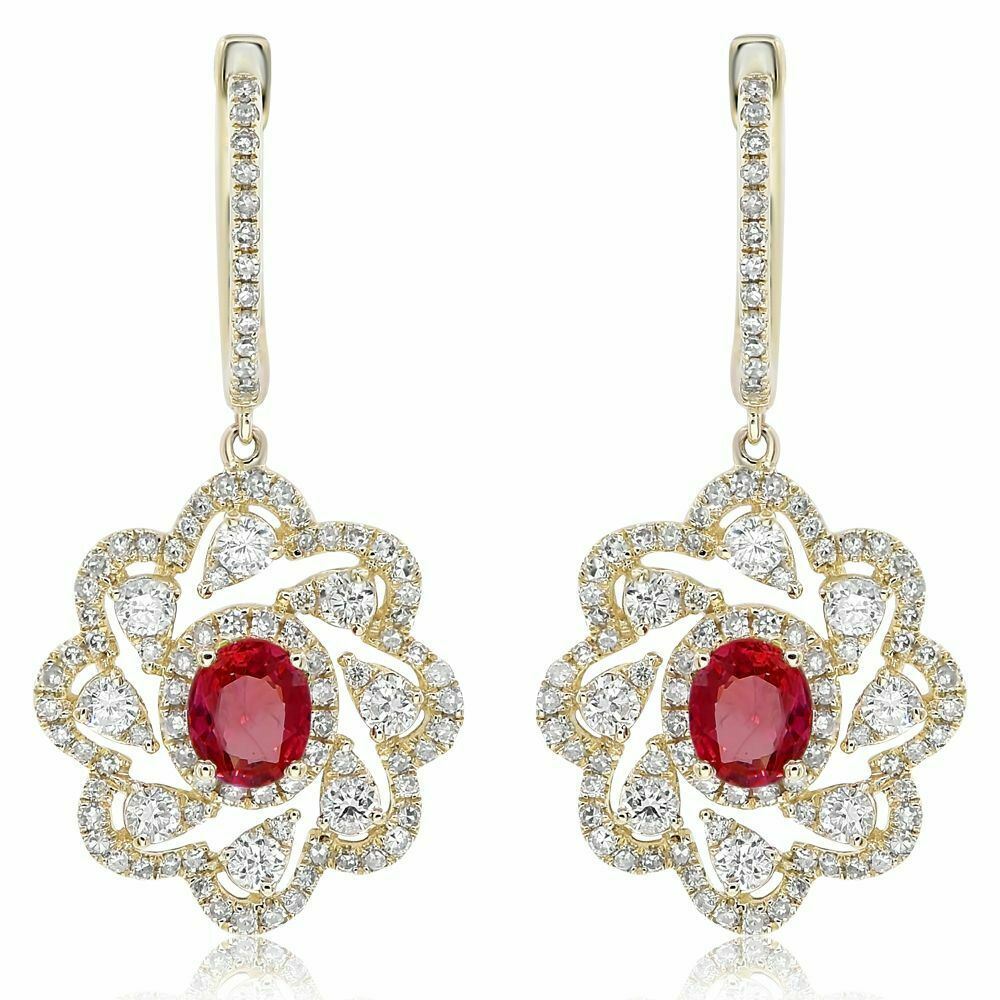 ESTATE14KT YELLOW GOLDHANGING EARRINGS. 3D FLOWERDESIGN. DIAMONDS ARE F/G COLOR, VSSI CLARITY 1.06 CARATS. AAA RUBIES ARE .88 CARATS.WRITTEN APPRAISAL AVAILABLE. COMES IN A PRESENTABLE GIFT BOX.