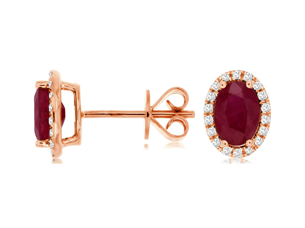 ESTATE 14KT ROSE GOLD STUD EARRINGS. 3D HALO CLASSIC DESIGN. ROUND DIAMONDS ARE F/G COLOR, VSSI CLARITY .19 CARATS. AAA OVAL RUBIES ARE 1.80 CARATS. WRITTEN APPRAISAL AVAILABLE. COMES IN A PRESENTABLE GIFT BOX.