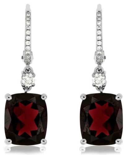 ESTATE 14KT WHITE GOLD LEVERBACK HANGING EARRINGS. 3D CLASSIC DESIGN. DIAMONDS ARE F/G COLOR, VSSI CLARITY .25 CARATS. AAA RHODOLITES ARE 9.80 CARATS. WRITTEN APPRAISAL AVAILABLE. COMES IN A PRESENTABLE GIFT BOX.