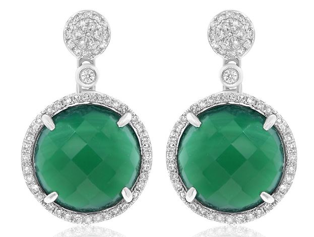 ESTATE 14KT WHITE GOLD FUN HANGING EARRINGS. 3D ROUND DESIGN. DIAMONDS ARE F/G COLOR, VSSI CLARITY .53 CARATS. AAA EXTRA FACETED ROUND AGATES ARE 9.85 CARATS. WRITTEN APPRAISAL AVAILABLE. COMES IN A PRESENTABLE GIFT BOX.