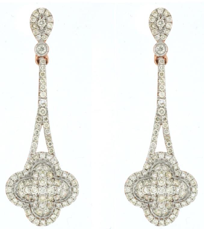 ESTATE 14KT ROSE GOLD LOVE HANGING EARRINGS. 3D CLASSIC FOUR LEAF CLOVER DESIGN. DIAMONDS ARE F/G COLOR, VSSI CLARITY 1.05 CARATS. WRITTEN APPRAISAL AVAILABLE. COMES IN A PRESENTABLE GIFT BOX.