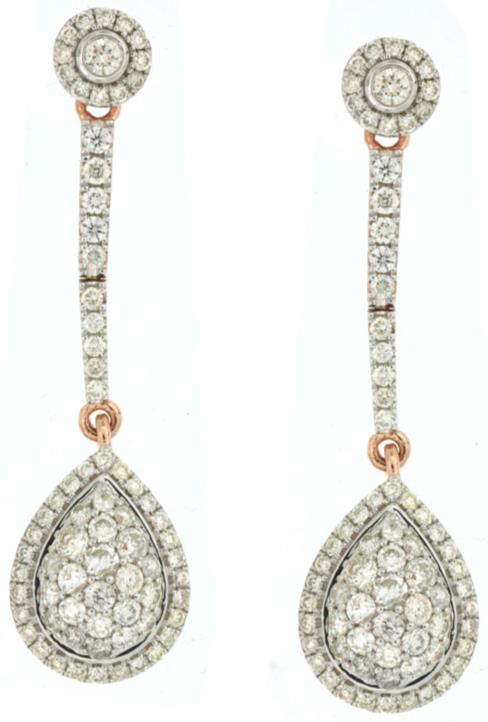 ESTATE 14KT WHITE AND ROSE GOLD HANGING EARRINGS. 3D CLASSIC CLUSTER TEAR DROP DESIGN. DIAMONDS ARE F/G COLOR, VSSI CLARITY 1.05 CARATS. WRITTEN APPRAISAL AVAILABLE. COMES IN A PRESENTABLE GIFT BOX.