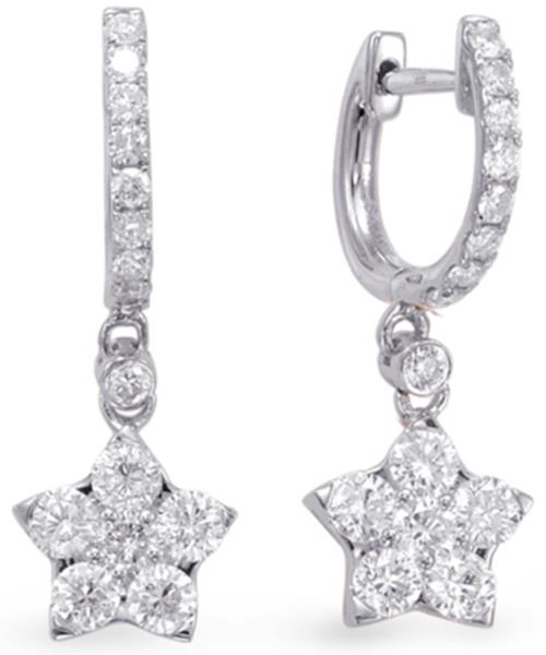 ESTATE 14KT WHITE GOLD LOVE HUGGIE HANGING EARRINGS. 3D CLUSTER STAR DESIGN. ROUND DIAMONDS ARE F/G COLOR, VSSI CLARITY 1.08 CARATS. MEASURES 8mm WIDE. WRITTEN APPRAISAL AVAILABLE. COMES IN A PRESENTABLE GIFT BOX.