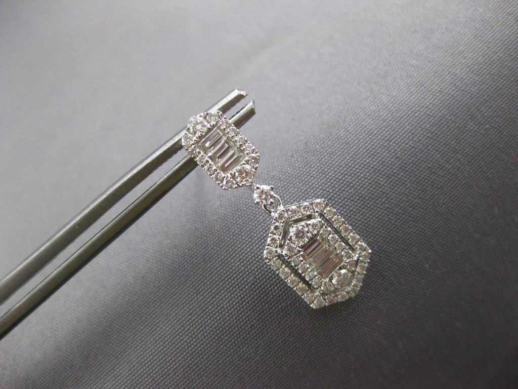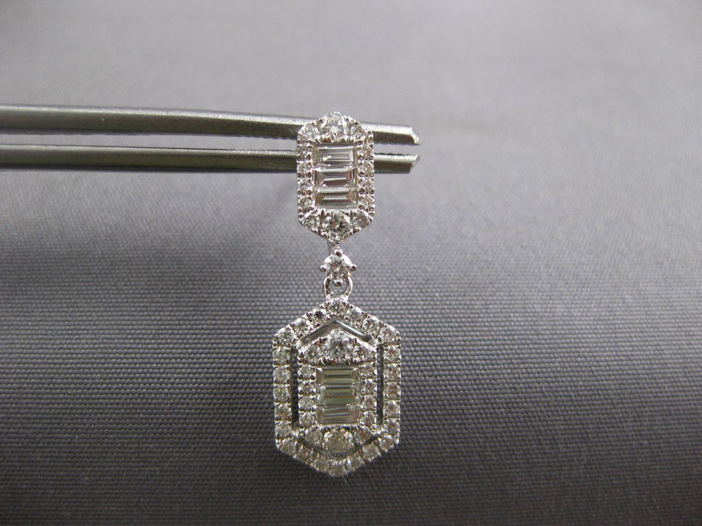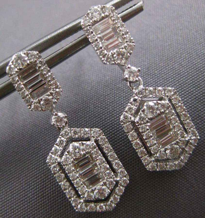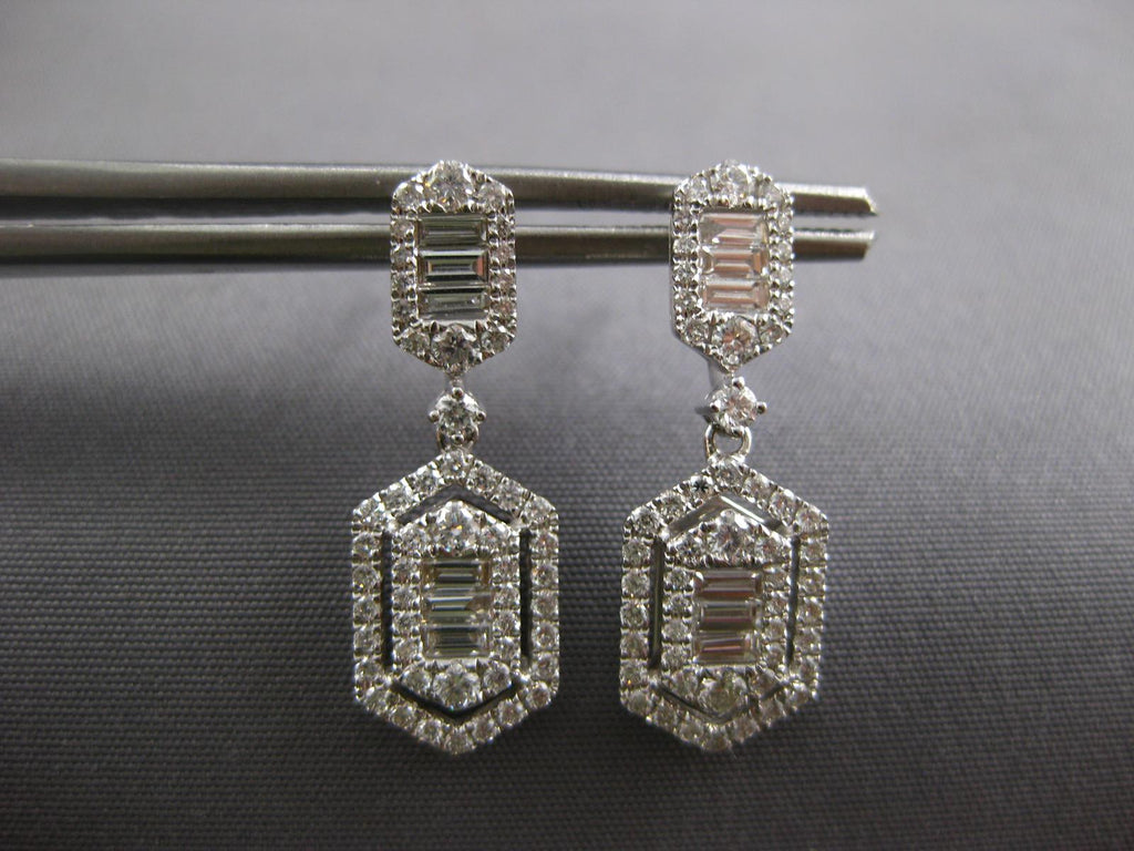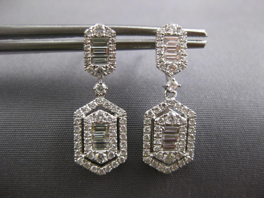ESTATE 18KT WHITE GOLD HANGING EARRINGS. 3D HEXAGON CLASSIC DESIGN. DIAMONDS ARE F/G COLOR, VS CLARITY. ROUND DIAMONDS ARE .80 CARATS. BAGUETTE DIAMONDS ARE .38 CARATS. MEASURES 24mm X 8mm. WRITTEN APPRAISAL AVAILABLE. COMES IN A PRESENTABLE GIFT BOX.