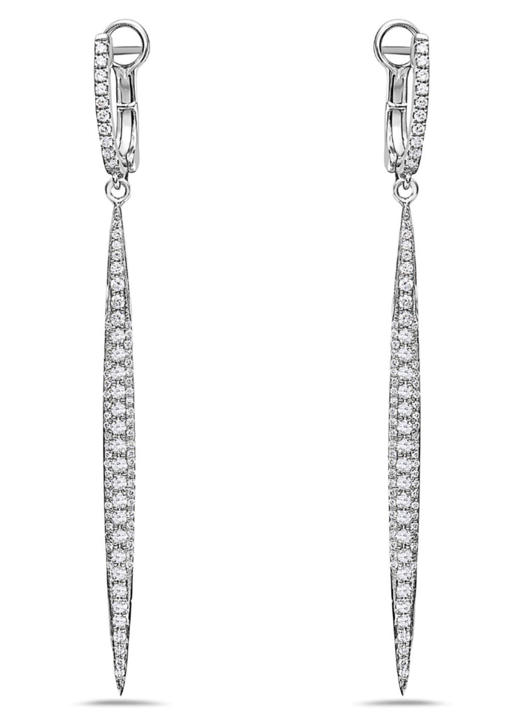 ESTATE 18KT WHITE GOLD LEVERBACK HANGING EARRINGS. 3D ELONGATED BAR DESIGN. DIAMONDS ARE F/G COLOR, VSSI CLARITY 1.21 CARATS. WRITTEN APPRAISAL AVAILABLE. COMES IN A PRESENTABLE GIFT BOX.