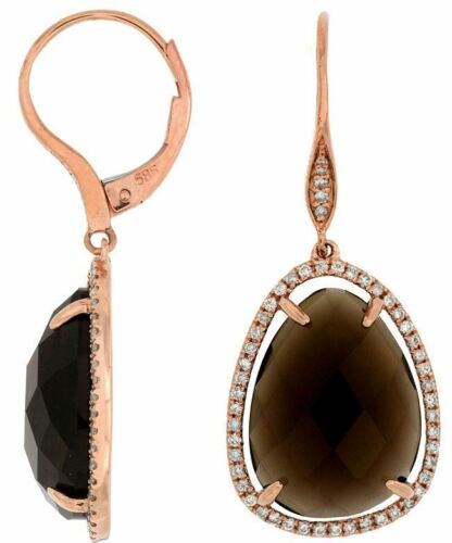 ESTATE 14KT ROSE GOLD LEVERBACK HANGING EARRINGS. 3D TEAR DROP HALO DESIGN. DIAMONDS ARE F/G COLOR, VSSI CLARITY .42 CARATS. AAA EXTRA FACETED SMOKEY TOPAZ ARE 14.0 CARATS. WRITTEN APPRAISAL AVAILABLE. COMES IN A PRESENTABLE GIFT BOX.