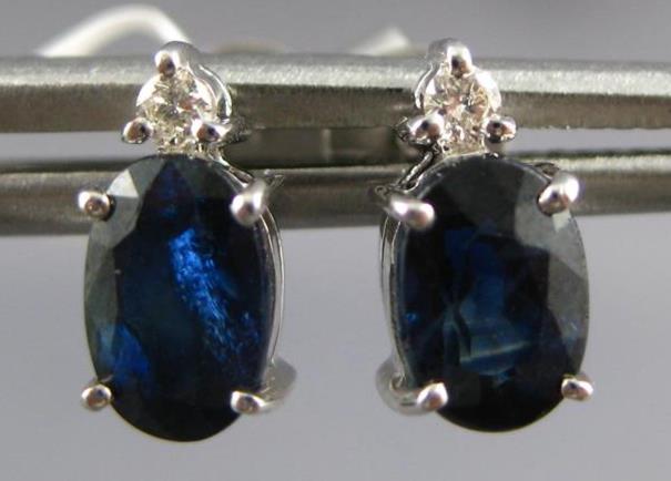 ESTATE 14KT WHITE GOLD STUD EARRINGS. 3D CLASSIC DESIGN. ROUND DIAMONDS ARE F/G COLOR, VSSI CLARITY .04 CARATS. AAA OVAL SAPPHIRES ARE 1.47 CARATS. MEASURES 8.5mm X 4mm. WRITTEN APPRAISAL AVAILABLE. COMES IN A PRESENTABLE GIFT BOX.