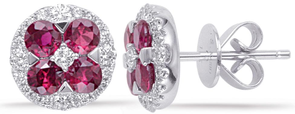 ESTATE 14KT WHITE GOLD STUD EARRINGS. 3D ROUND FLOWER DESIGN. DIAMONDS ARE F/G COLOR, VSSI CLARITY .37 CARATS. AAA RUBIES ARE 1.20 CARATS. MEASURES 9mm WIDE. WRITTEN APPRAISAL AVAILABLE. COMES IN A PRESENTABLE GIFT BOX.