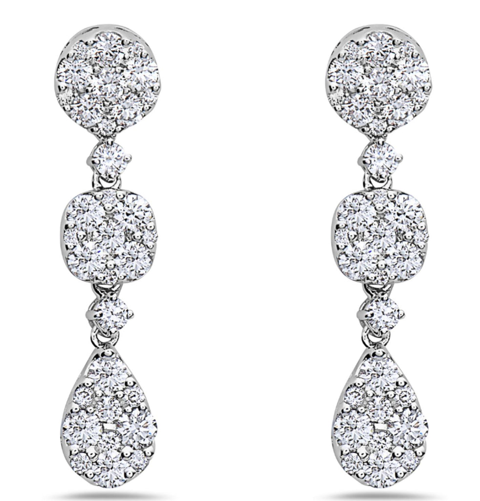 ESTATE 18KT WHITE GOLD HANGING EARRINGS. 3D CIRCULAR SQUARE TEAR DROP DESIGN. DIAMONDS ARE F/G COLOR, VSSI CLARITY 1.66 CARATS. WRITTEN APPRAISAL AVAILABLE. COMES IN A PRESENTABLE GIFT BOX.
