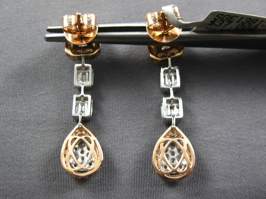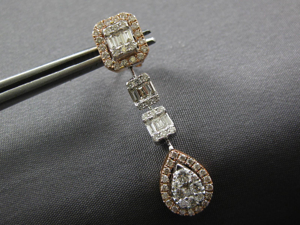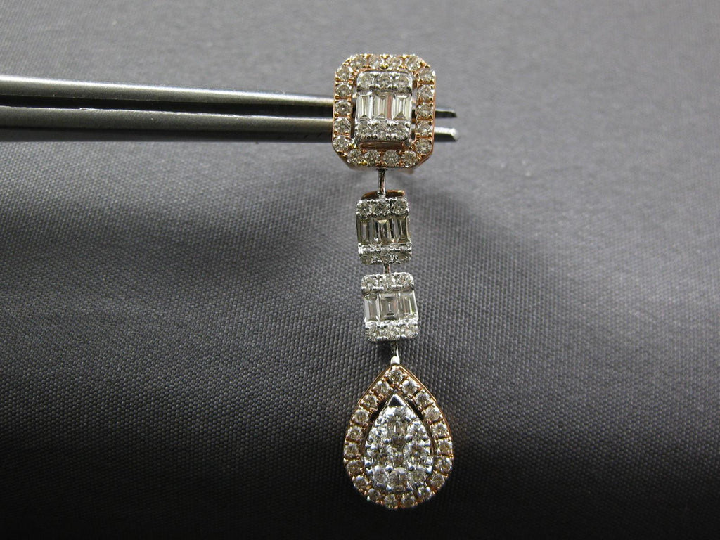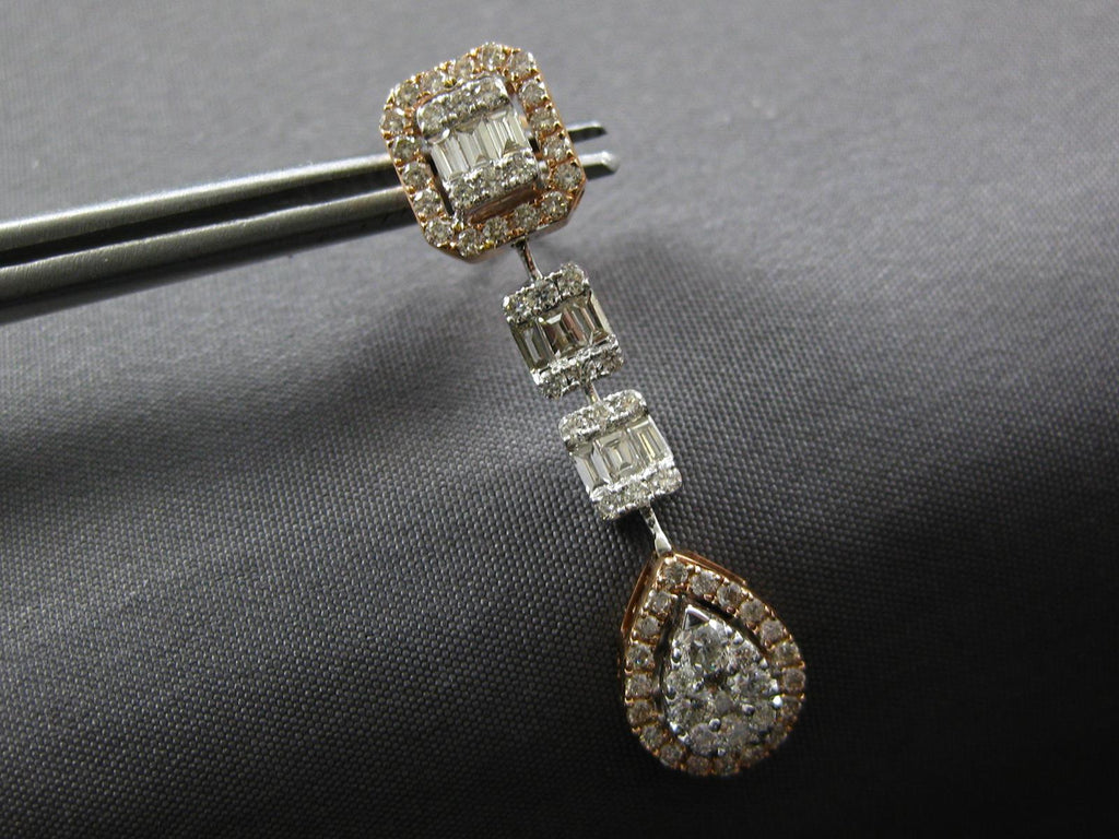 ESTATE14KT WHITE AND ROSE GOLD HANGING EARRINGS. 3D TEAR DROP SQUARE DESIGN. ROUND AND BAGUETTE DIAMONDS ARE F/G COLOR, VSSI CLARITY 1.78 CARATS. MEASURES 32.5MM X 8.5MM. WRITTEN APPRAISAL AVAILABLE. COMES IN A PRESENTABLE GIFT BOX.