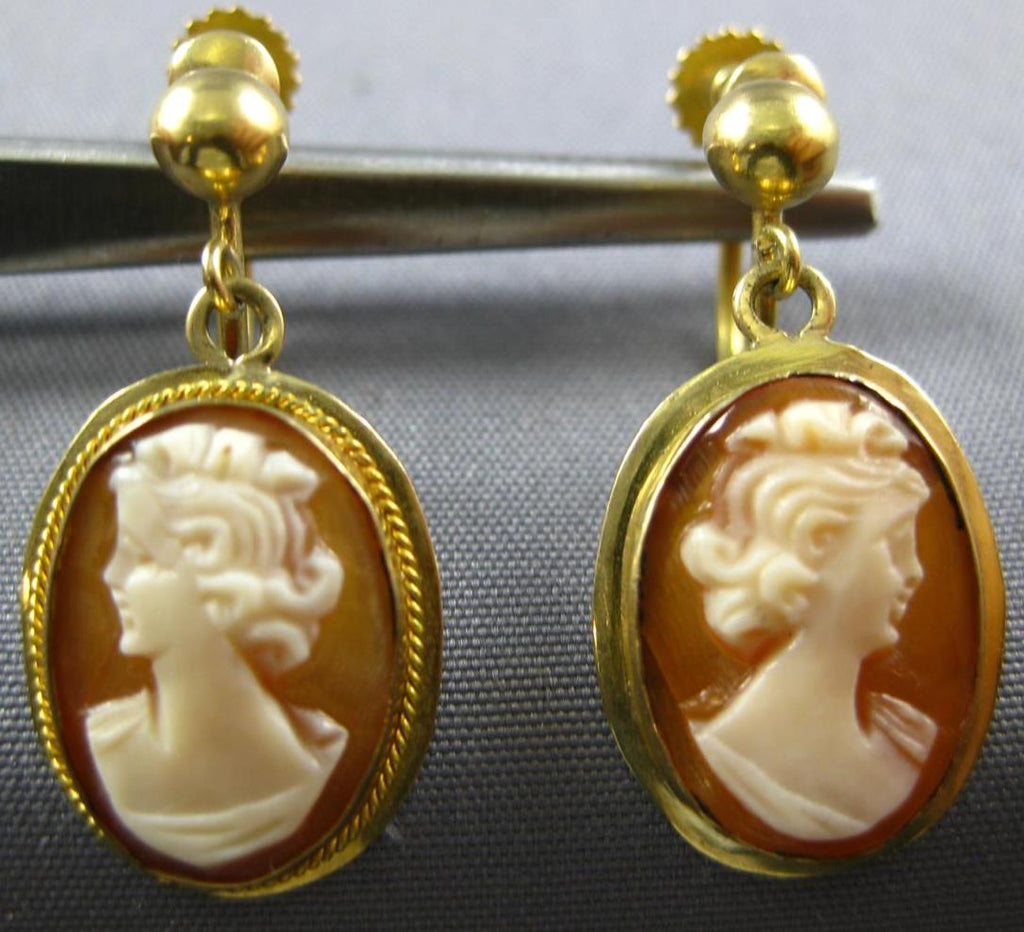 ESTATE 18KT YELLOW GOLD 3D CLASSIC LADY CAMEO OVAL SCREWBACK HANGING EARRINGS