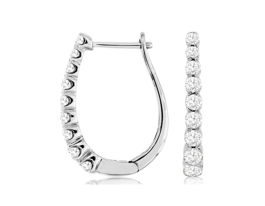 ESTATE 14KT WHITE GOLD HUGGIE LEVERBACK HANGING EARRINGS. 3D CLASSIC GRADUATING OVAL DESIGN. ROUND DIAMONDS ARE F/G COLOR, VSSI CLARITY 1.0 CARAT. WRITTEN APPRAISAL AVAILABLE. COMES IN A PRESENTABLE GIFT BOX.