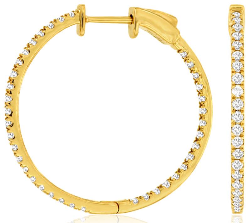 ESTATE 14KT YELLOW GOLD HOOP HANGING EARRINGS. 3D CLASSIC INSIDE OUT DESIGN. DIAMONDS ARE F/G COLOR, VSSI CLARITY 1.0 CARAT. WRITTEN APPRAISAL AVAILABLE. COMES IN A PRESENTABLE GIFT BOX.