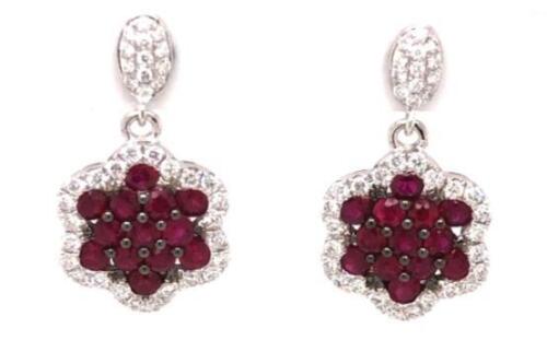 ESTATE 18KT WHITE GOLD HANGING EARRINGS. 3D FLOWER DESIGN. DIAMONDS ARE F/G COLOR, VSSI CLARITY .53 CARATS. AAA RUBIES ARE 1.48 CARATS. WRITTEN APPRAISAL AVAILABLE. COMES IN A PRESENTABLE GIFT BOX.
