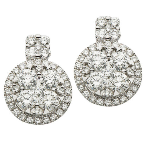 ESTATE 18KT WHITE GOLD HANGING EARRINGS. 3D CLASSIC ROUND CLUSTER FLOWER DESIGN. DIAMONDS ARE F/G COLOR, VSSI CLARITY 2.02 CARATS. WRITTEN APPRAISAL AVAILABLE. COMES IN A PRESENTABLE GIFT BOX.