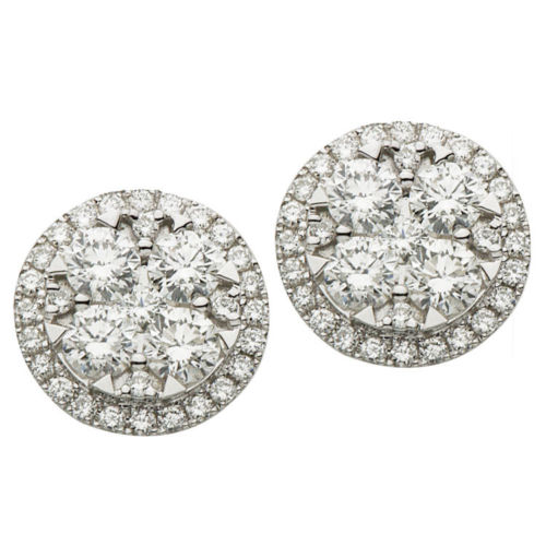 ESTATE 18KT WHITE GOLD STUD EARRINGS. 3D CLASSIC ROUND CLUSTER FLOWER DESIGN. DIAMONDS ARE F/G COLOR, VSSI CLARITY 2.03 CARATS. WRITTEN APPRAISAL AVAILABLE. COMES IN A PRESENTABLE GIFT BOX.