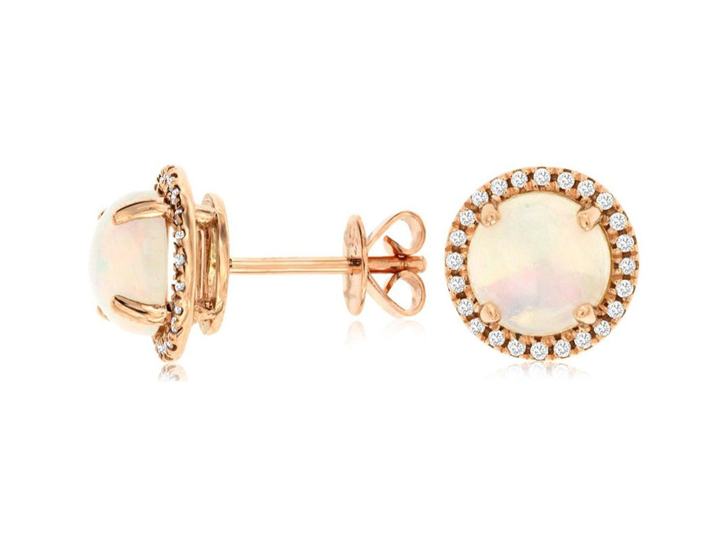 ESTATE 14KT ROSE GOLD STUD EARRINGS. 3D CLASSIC HALO DESIGN. ROUND DIAMONDS ARE F/G COLOR, VSSI CLARITY .15 CARATS. AAA ROUND OPALS ARE 1.90 CARATS. WRITTEN APPRAISAL AVAILABLE. COMES IN A PRESENTABLE GIFT BOX.