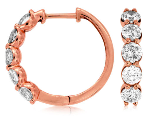 ESTATE 14KT ROSE GOLD HUGGIE HOOP EARRINGS. 3D CLASSIC FIVE STONE DESIGN. DIAMONDS ARE F/G COLOR, VSSI CLARITY 2.0 CARATS. WRITTEN APPRAISAL AVAILABLE. COMES IN A PRESENTABLE GIFT BOX.
