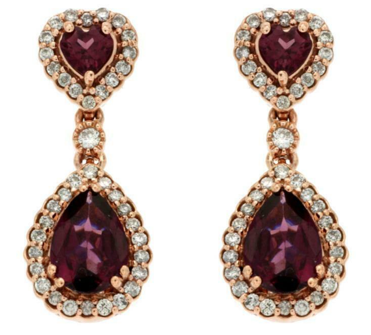 ESTATE 14KT ROSE GOLD HANGINGEARRINGS. 3D TEAR DROP HEART SHAPEDESIGN. DIAMONDS ARE F/G COLOR, VSSI CLARITY .75 CARATS. AAA RHODOLITES ARE ARE 1.35CARATS. WRITTEN APPRAISAL AVAILABLE. COMES IN A PRESENTABLE GIFT BOX.