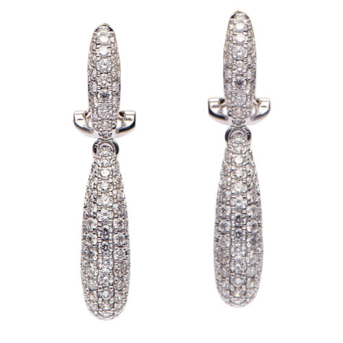 ESTATE 18KT WHITE GOLD CLIP ON HANGING EARRINGS. 3D CLASSIC TEAR DROP DESIGN. DIAMONDS ARE F/G COLOR, VSSI CLARITY 2.13 CARATS. WRITTEN APPRAISAL AVAILABLE. COMES IN A PRESENTABLE GIFT BOX.