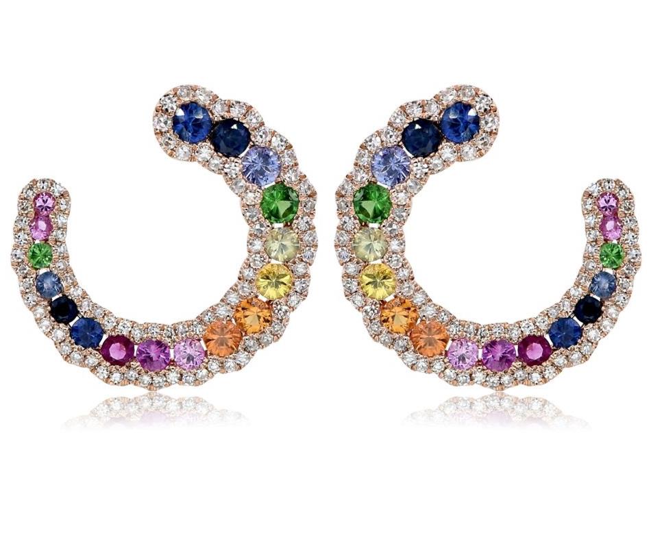 ESTATE 14KT ROSE GOLD FUN EARRINGS. 3D SEMI MOON CLIP ON DESIGN. DIAMONDS ARE F/G COLOR, VSSI CLARITY .55 CARATS. AAA MULTI COLOR SAPPHIRES ARE 1.59 CARATS. WRITTEN APPRAISAL AVAILABLE. COMES IN A PRESENTABLE GIFT BOX.