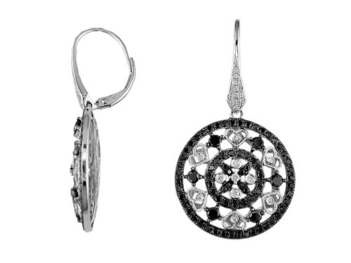 ESTATE 14KT WHITE GOLD LEVERBACK HANGING EARRINGS. 3D CIRCULAR HEART DESIGN. DIAMONDS ARE F/G COLOR, VSSI CLARITY .20 CARATS. BLACK DIAMONDS ARE 2.0 CARATS. WRITTEN APPRAISAL AVAILABLE. COMES IN A PRESENTABLE GIFT BOX.