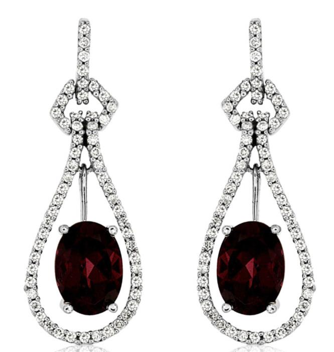 ESTATE 14KT WHITE GOLD HANGING EARRINGS. 3D TEAR DROPDESIGN. ROUND DIAMONDS ARE F/G COLOR, VSSI CLARITY 0.34 CARATS. OVAL AAA RHODILITE ARE 1.95 CARATS.WRITTEN APPRAISAL AVAILABLE. COMES IN A PRESENTABLE GIFT BOX.