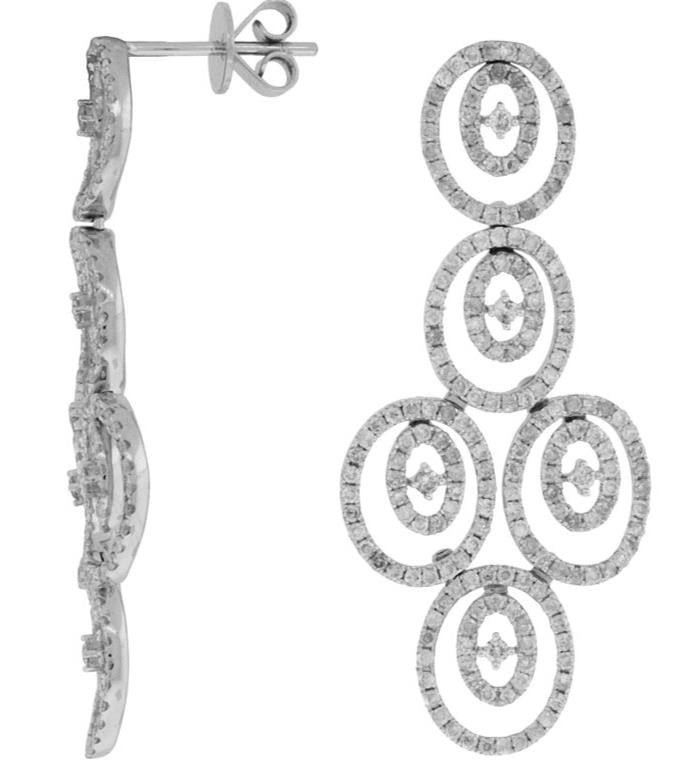 ESTATE 14KT WHITE GOLD FUN HANGING EARRINGS. 3D MULTI OVAL ETOILE DESIGN. ROUND DIAMONDS ARE F/G COLOR, VSSI CLARITY 2.33 CARATS. WRITTEN APPRAISAL AVAILABLE. COMES IN A PRESENTABLE GIFT BOX.