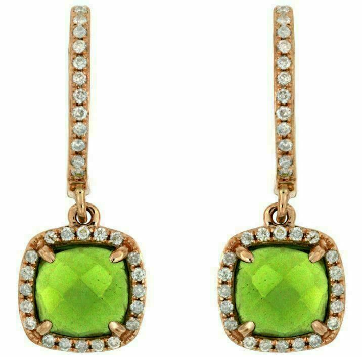 ESTATE 14KT ROSE GOLD HANGING EARRINGS. 3D HALO SQUAREDESIGN. ROUND DIAMONDS ARE F/G COLOR, VSSI CLARITY .25 CARATS.AAA EXTRA FACETED CUSHION CUT PERIDOTS ARE 2.10 CARATS. WRITTEN APPRAISAL AVAILABLE. COMES IN A PRESENTABLE GIFT BOX.