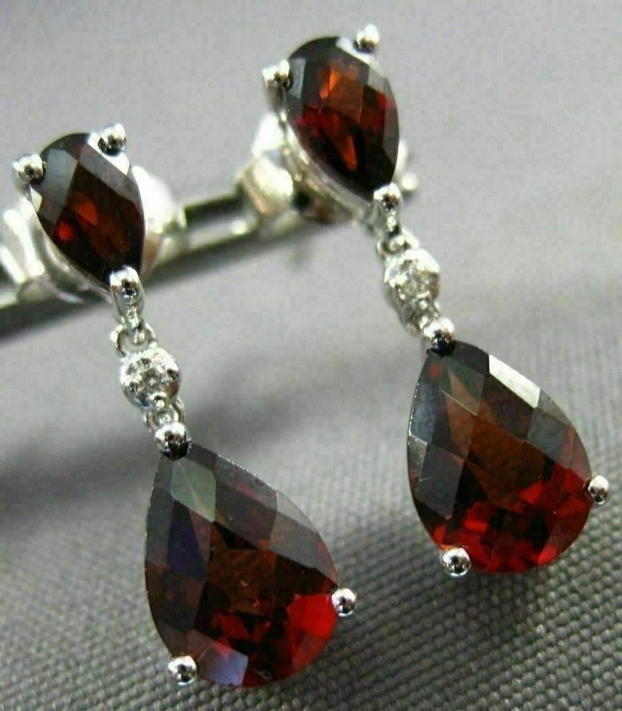 ESTATE 14KT WHITE GOLD HANGING EARRINGS. 3D TEAR DROP DESIGN. DIAMONDS ARE F/G COLOR, VSSI CLARITY .01 CARATS. AAA GARNETS ARE 2.40 CARATS. MEASURES 17mm X 5mm. WRITTEN APPRAISAL AVAILABLE. COMES IN A PRESENTABLE GIFT BOX.