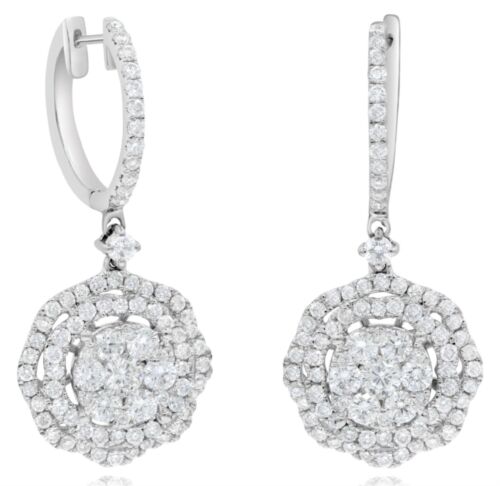 ESTATE 18KT WHITE GOLD HUGGIE HANGING EARRINGS. 3D CLUSTER FLOWER DESIGN. ROUND DIAMONDS ARE F/G COLOR, VSSI CLARITY 2.42 CARATS. WRITTEN APPRAISAL AVAILABLE. COMES IN A PRESENTABLE GIFT BOX.
