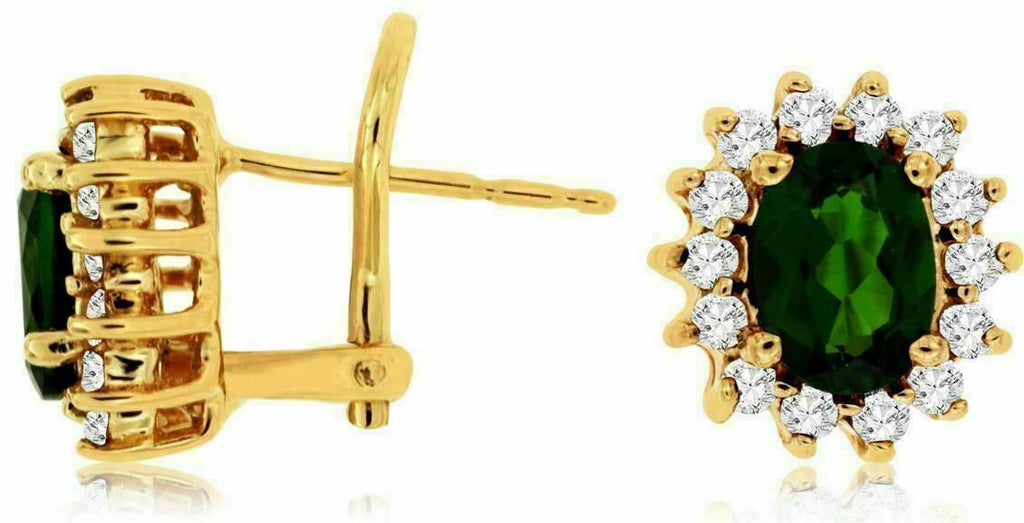 ESTATE 14KT YELLOW GOLD EARRINGS. 3D CLASSIC FLOWER HALO DESIGN. ROUND DIAMONDS ARE F/G COLOR, VSSI CLARITY .60 CARATS. AAA OVAL EXTRA FACETED RUSSALITES ARE 1.90 CARATS. WRITTEN APPRAISAL AVAILABLE. COMES IN A PRESENTABLE GIFT BOX.