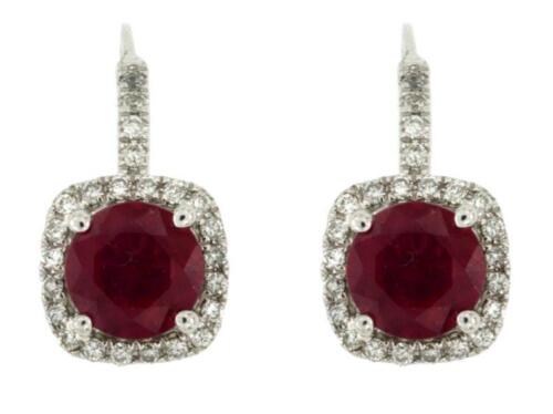 ESTATE 14KT WHITE GOLD LEVERBACK HANGING EARRINGS. 3D HALO SQUARE DESIGN. DIAMONDS ARE F/G COLOR, VSSI CLARITY .30 CARAT. AAA ROUND RUBIES ARE 2.30 CARATS. AAA RUBY HAS SIGNS OF DIFFUSION. WRITTEN APPRAISAL AVAILABLE. COMES IN A PRESENTABLE GIFT BOX.